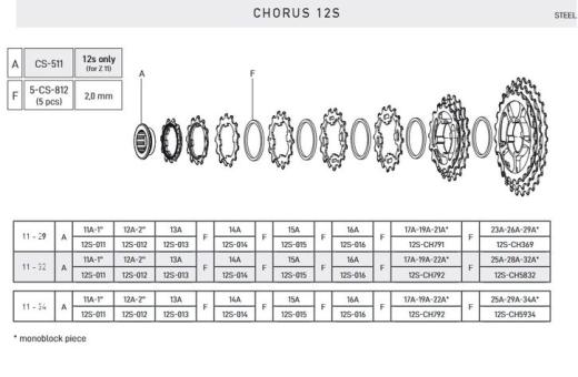 Mit der neuen Chorus-Gruppe, die eine komplette Kompatibilität mit den Kassetten bietet, die mit den Gruppen Super Record und Record 2x12 Speed (11-29 und 11-32) eingeführte wurden, wird eine neue Kassetten-Spezifikation (11-34) nur kompatibel mit dem Chorus 12S-Antriebssystem. Die neue Kassette 11-34 bietet dem Radfahrer tatsächlich noch mehr Vielseitigkeit und mehr Auswahl und Autonomie in Bezug auf nutzbare Übersetzungen.