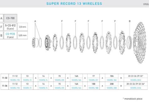 Auf Grundlage der Erfahrungen mit den Ekar 13 hat Campagnolo eine neue Kassette für die Super-Record-13-Gruppe entwickelt, die eine flüssigere, schnellere und präzisere Schaltung ermöglicht. Dank der weniger dicken Ritzel und der Optimierung der Abstände konnte eine zusätzliche Übersetzung hinzugefügt werden, ohne den Standard des Freilaufkörpers zu verändern: Der bewährte N3W-Standard wird beibehalten, ohne dass spezielle Adapter oder Naben erforderlich sind. Die neue Zahnprofilierung reduziert in Kombination mit dem Oberflächenfinish in Black Chrome die Geräuschentwicklung und verbessert die Verschleißfestigkeit und Lebensdauer. Die Progression der Übersetzungsverhältnisse ist linearer, was eine ideale Trittfrequenz unter allen Bedingungen, sei es am Berg oder in der Ebene, begünstigt. Der kleinere Unterschied zwischen den Ritzeln ermöglicht ein effizienteres Kraftmanagement und hilft dem Sportler, seine Leistung zu optimieren und die Anstrengung zu reduzieren.