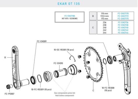 Die beiden Tretkurbeln aus Aluminium sind mit Achshälften aus AISI 630-Stahl ausgestattet. Dies entspricht der geschickten Materialkombination der gesamten Ekar GT-Gruppe, um stets leichte Komponenten, aber mit maximaler Effizienz und Dauerhaftigkeit zu erhalten.