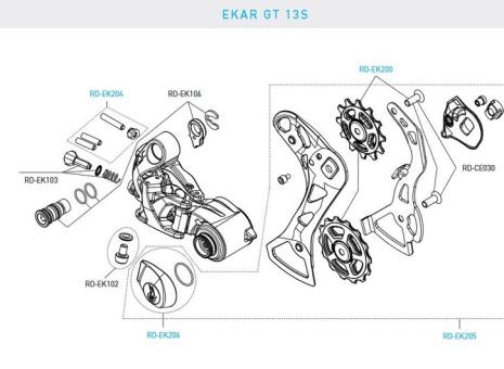Die Konstruktion des Schaltwerks mit mittellangem Überwerfer ist mit den verschiedenen Kettenradgrößen bei allen vier Schaltwerkoptionen der Kassette von 9-36 bis 10-48 kompatibel und perfekt für jeden Gravelbedarf. Der 2D-Verlauf des Parallelogramms wurde speziell für das Ekar GT 1x-System konzipiert, so dass das Schaltwerk präzise mechanische Bewegungen ausführt, um die 13 Kettenräder optimal zu nutzen. Seine übergroßen Schaltrollen garantieren einen optimalen Betrieb und eine hohe Kettenhaftung, um Sicherheit und Ruhe zu gewährleisten, egal auf welchem ??Gelände Sie sich befinden. Die Kupplung, die für eine höhere Zuverlässigkeit der Kettenhaftung und minimale Betriebsgeräusche permanent eingerückt ist, kann zum einfachen Entfernen des Laufrads nach vorne verriegelt werden. Allein im Ekar GT-Schaltwerk stecken mehr als 70 sorgfältig entworfene und konstruierte Einzelteile.