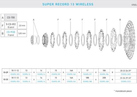 Auf Grundlage der Erfahrungen mit den Ekar 13 hat Campagnolo eine neue Kassette für die Super-Record-13-Gruppe entwickelt, die eine flüssigere, schnellere und präzisere Schaltung ermöglicht. Dank der weniger dicken Ritzel und der Optimierung der Abstände konnte eine zusätzliche Übersetzung hinzugefügt werden, ohne den Standard des Freilaufkörpers zu verändern: Der bewährte N3W-Standard wird beibehalten, ohne dass spezielle Adapter oder Naben erforderlich sind. Die neue Zahnprofilierung reduziert in Kombination mit dem Oberflächenfinish in Black Chrome die Geräuschentwicklung und verbessert die Verschleißfestigkeit und Lebensdauer. Die Progression der Übersetzungsverhältnisse ist linearer, was eine ideale Trittfrequenz unter allen Bedingungen, sei es am Berg oder in der Ebene, begünstigt. Der kleinere Unterschied zwischen den Ritzeln ermöglicht ein effizienteres Kraftmanagement und hilft dem Sportler, seine Leistung zu optimieren und die Anstrengung zu reduzieren.