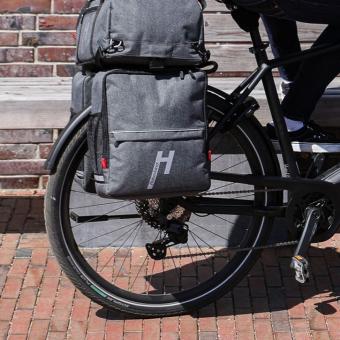 Die praktisch-sportliche Doppeltasche. Der »Transporter« ist eine flexible Doppeltasche und bietet mit 30 Litern Volumen viel Platz für große oder kleine Touren. Mit den Klettverbindungen ist ein einfaches und schnelles Anbringen an jeden Fahrradgepäckträger - auch ohne Federklappe - möglich. Beide Seiten verfügen jeweils über ein Netzfach. So können gleich zwei Trinkflaschen mitgeführt werden. Die darunter befindlichen Reflexstreifen und die reflektierenden Logos bieten dir Sicherheit, wenn sie im Dunkeln angestrahlt werden. Durch die umlaufenden Reißverschlüsse an den Taschenfronten kannst du deinen »Transporter« ordentlich bepacken. Der Inhalt lässt sich dadurch schnell erreichen, auch wenn sich über der Tasche ein Aufbau befindet, wie z.B. die dazu passende Sporttasche »TranSPORTer« (ESP100). Auf der Taschenoberseite sind unter Klettabdeckungen noch Steckverbindungen mit denen sich die beiden Taschen zum Set zusammenfügen lassen. Klettbänder verhindern zusätzlich ein Verrutschen während der Fahrt, indem du damit die Doppeltasche an den Gepäckträgerstreben befestigst.