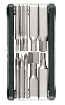 Das Minitool hat 11 Werkzeuge für den Fall der Fälle an Bord: Mit Innensechskantschlüsseln, Schraubendrehern und Torx-Schlüsseln kannst du Reparaturen am Fahrrad unkompliziert erledigen. Alle Tools sind aus hochwertigem Chrom-Vanadium-Stahl gefertigt. Das abgerundete Gehäuse aus Aluminium mit ergonomisch gefasten Griff-Flächen sorgt für ein sicheres und angenehmes Handling beim Schrauben.