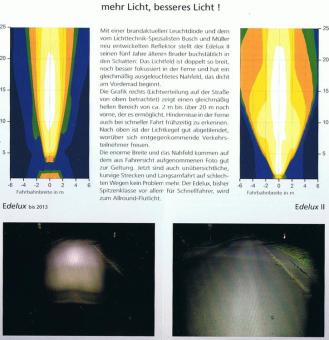 Mit einer brandaktuellen Leuchtdiode und dem vom Lichttechnik-Spezialisten Busch und Müller neu entwickelten Reflektor stellt der Edelux II seinen fünf Jahre älteren Bruder buchstäblich in den Schatten: Das Lichtfeld ist doppelt so breit, noch besser fokusiert in der Ferne und hat ein gleichmäßig ausgeleuchtetes Nahfeld, das dicht am Vorderrad beginnt.