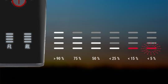 Der LED-Indikator auf der AURA 100 LINK zeigt stets den Akkustand von Front- und Rückleuchte. Mit seinen fünf Stufen weißt du immer, wann AURA 100 oder BLAZE LINK wieder ans USB-Ladekabel müssen. Auch der Fortschritt des Ladevorgangs wird dir hier angezeigt.