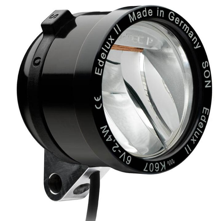Mit einer brandaktuellen Leuchtdiode und dem vom Lichttechnik-Spezialisten Busch und Müller neu entwickelten Reflektor stellt der Edelux II seinen fünf Jahre älteren Bruder buchstäblich in den Schatten: Das Lichtfeld ist doppelt so breit, noch besser fokusiert in der Ferne und hat ein gleichmäßig ausgeleuchtetes Nahfeld, das dicht am Vorderrad beginnt.
