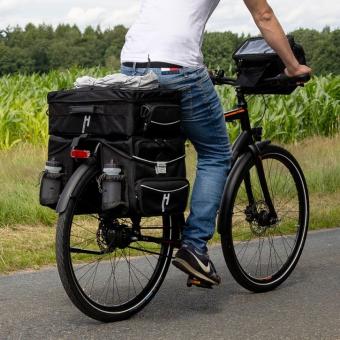 Die Doppelte für die große Reise. Unsere »Touring Max« ist robust und vielseitig. Gefertigt aus wasserdichten Polyesterstoffen, bietet sie dir mit einem Volumen von 33 Litern auch viel Stauraum in den großen Reißverschluss-Außentaschen. In den beiden kleineren an den Klappenteilen versteckt sich zusätzlich die angebrachte Schloss-Aufnahme, mit der du diese Doppeltasche mit dem passenden Topcase spielend leicht zum Set kombinieren kannst. Es bleibt also dir überlassen, ob du dieses Modell alltäglich oder/und für die großen Radreisen nutzt. Die ausklappbaren Flaschenfächer auf den Hinterseiten geben dir die Möglichkeit deine Getränke aufrecht zu transportieren. Ausgestattet mit reflektierenden Metallschlössern öffnest du die Tasche kinderleicht mit einer Hand. Außerdem stellen die weiteren Reflex-Elemente eine bessere Sichtbarkeit bei schlechteren Witterungsverhältnissen oder Dunkelheit sicher. Im Inneren der Taschenseiten findest du weitere Fächer, in denen sich Kleinigkeiten leicht wiederfinden lassen. Befestigt wird »Touring Max« mit der Federklappe deines Gepäckträgers, indem du diese durch die Öffnungen im Brückenteil führst. Mit einem zusätzlichen Klettband befestigst du die Tasche an Fahrrad-Gepäckträgern ohne Federklappe. Um ein Pendeln während der Fahrt zu vermeiden, ist diese Doppeltasche mit Schienen und Schiebestücken zur Rahmenfixierung ausgestattet. Dieses Modell gibt es auch in der Standard-»Max«-Ausführung, ohne Erweiterungsmöglichkeit.