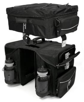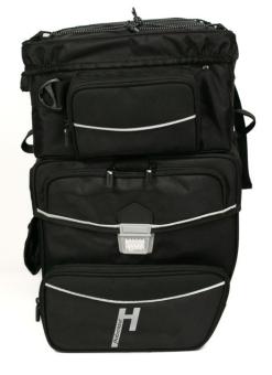 Der Koffer für die große Tour. Die Serie »Touring Max« hat alles, was du für eine lange Radreise benötigst. Sie ist robust und formstabil. Alle Teile dieser Serie sind funktionell verarbeitet und langlebig. So kannst du das 28 Liter fassende Topcase wahlweise mit Einzeltaschen (17 Liter) oder der Doppeltasche (33 Liter) spielend leicht zum Set kombinieren. Dabei werden die in der kleineren Vortasche versteckt angebrachten Schloss-Aufnahmen der Seitentaschen mit dem Topcase-Schloss fest verbunden und können auf Tastendruck schnell wieder gelöst werden. Zusätzlich verhindern Klettbandstreifen ein Verrutschen der einzelnen Elemente. Der bruchsichere und formstabile Kunststoffeinsatz ist abwischbar. Das Topcase kann wie ein Koffer beladen werden, denn mit dem Reißverschluss lässt es sich komplett öffnen. Reflektierende Elemente sowie die reflektierenden Metallschlösser sorgen für deine Sicherheit auch bei schlechten Sichtverhältnissen. Auf dem Klappenteil lässt sich unter den Spannbändern zusätzliches Gepäck verstauen. Deine Regenkleidung ist so z. B. schnell griffbereit. Mit dem Tragegriff oder Schultergurt kannst du das Topcase auch ohne Fahrrad gut transportieren. Also ab aufs Rad und viel Spaß im Fahrradurlaub!