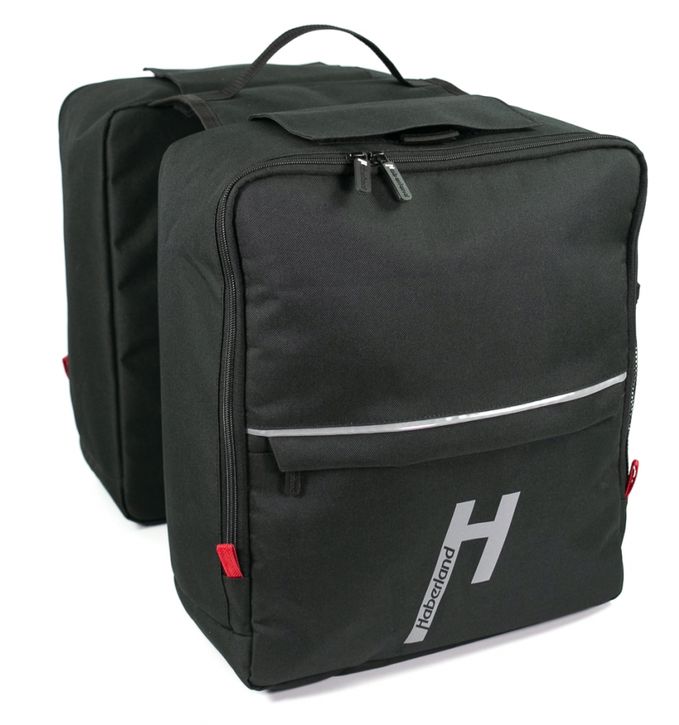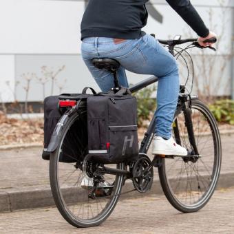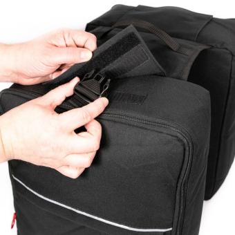 Die praktisch-sportliche Doppeltasche. Der »Transporter« ist eine flexible Doppeltasche und bietet mit 30 Litern Volumen viel Platz für große oder kleine Touren. Mit den Klettverbindungen ist ein einfaches und schnelles Anbringen an jeden Fahrradgepäckträger - auch ohne Federklappe - möglich. Beide Seiten verfügen jeweils über ein Netzfach. So können gleich zwei Trinkflaschen mitgeführt werden. Die darunter befindlichen Reflexstreifen und die reflektierenden Logos bieten dir Sicherheit, wenn sie im Dunkeln angestrahlt werden. Durch die umlaufenden Reißverschlüsse an den Taschenfronten kannst du deinen »Transporter« ordentlich bepacken. Der Inhalt lässt sich dadurch schnell erreichen, auch wenn sich über der Tasche ein Aufbau befindet, wie z.B. die dazu passende Sporttasche »TranSPORTer« (ESP100). Auf der Taschenoberseite sind unter Klettabdeckungen noch Steckverbindungen mit denen sich die beiden Taschen zum Set zusammenfügen lassen. Klettbänder verhindern zusätzlich ein Verrutschen während der Fahrt, indem du damit die Doppeltasche an den Gepäckträgerstreben befestigst.
