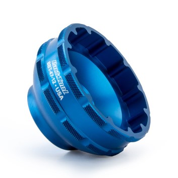 Ein Präzisionswerkzeug aus CNC-gefrästem Aluminium für die Montage und Demontage ausgewählter Gewinde-Tretlager mit 12-Kerben-Werkzeuganschlüssen, einschließlich Chris King ThreadFit T47 & ThreadFit 30 Tretlagern. Es wird von Park Tool selbst hergestellt, ist zur einfachen Identifizierung eloxiert und verfügt über einen 3/8"-Antrieb, der mit Ratschen-/Drehmomentschlüsseln kompatibel ist.